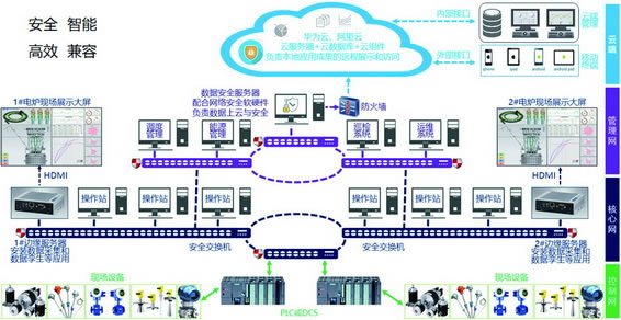 優(yōu)勢:包含控制網(wǎng)、核心網(wǎng)、管理網(wǎng)以及云端四級工廠網(wǎng)絡,兼容開放性好,設置軟硬件結合的縱深防御措施,安全性好,根據(jù)實時參數(shù),按照模型進行仿真,推薦合理的運行參數(shù),結合礦熱爐工藝參數(shù)、運行參數(shù),計算出電極工作端實際位置